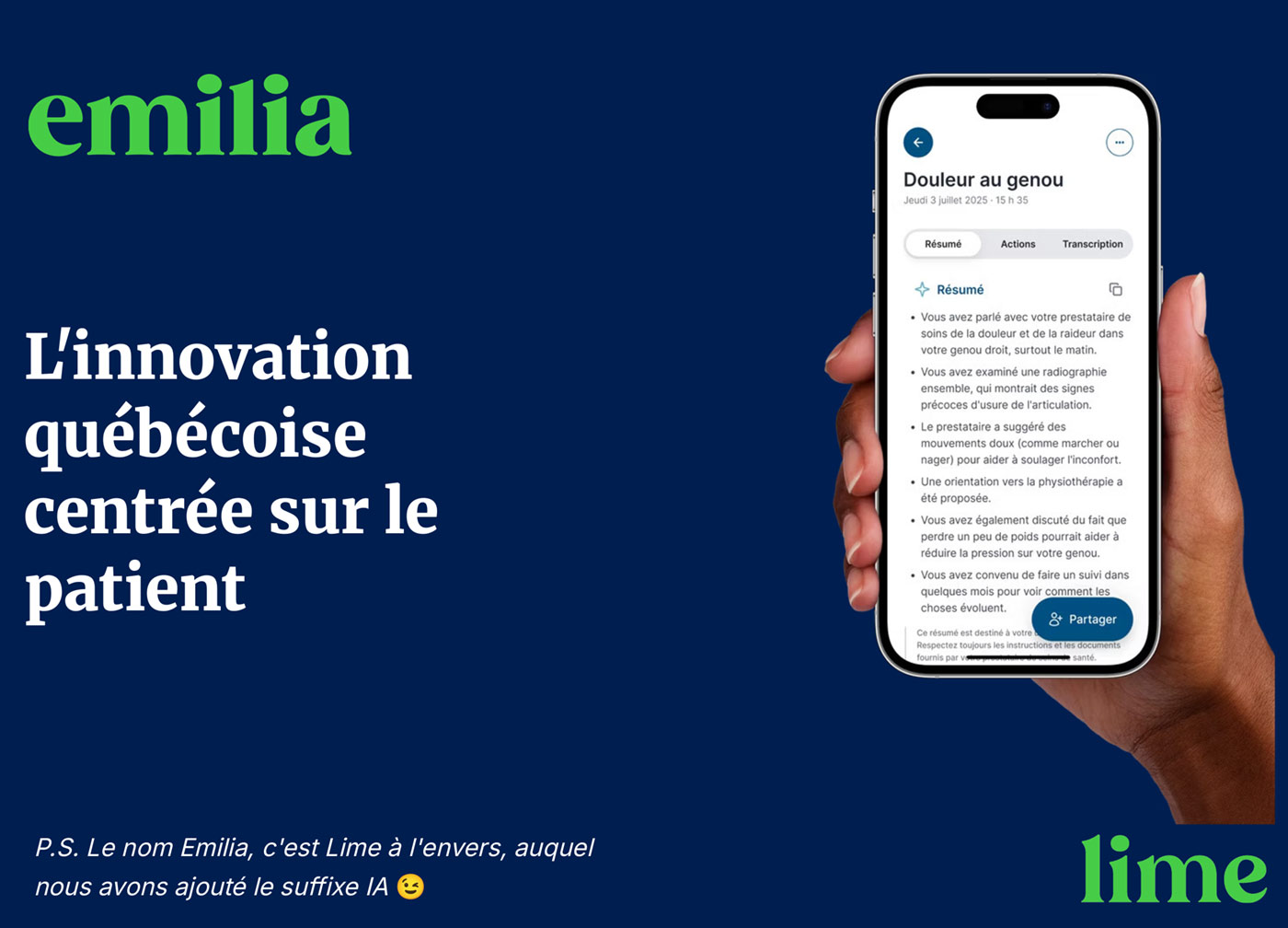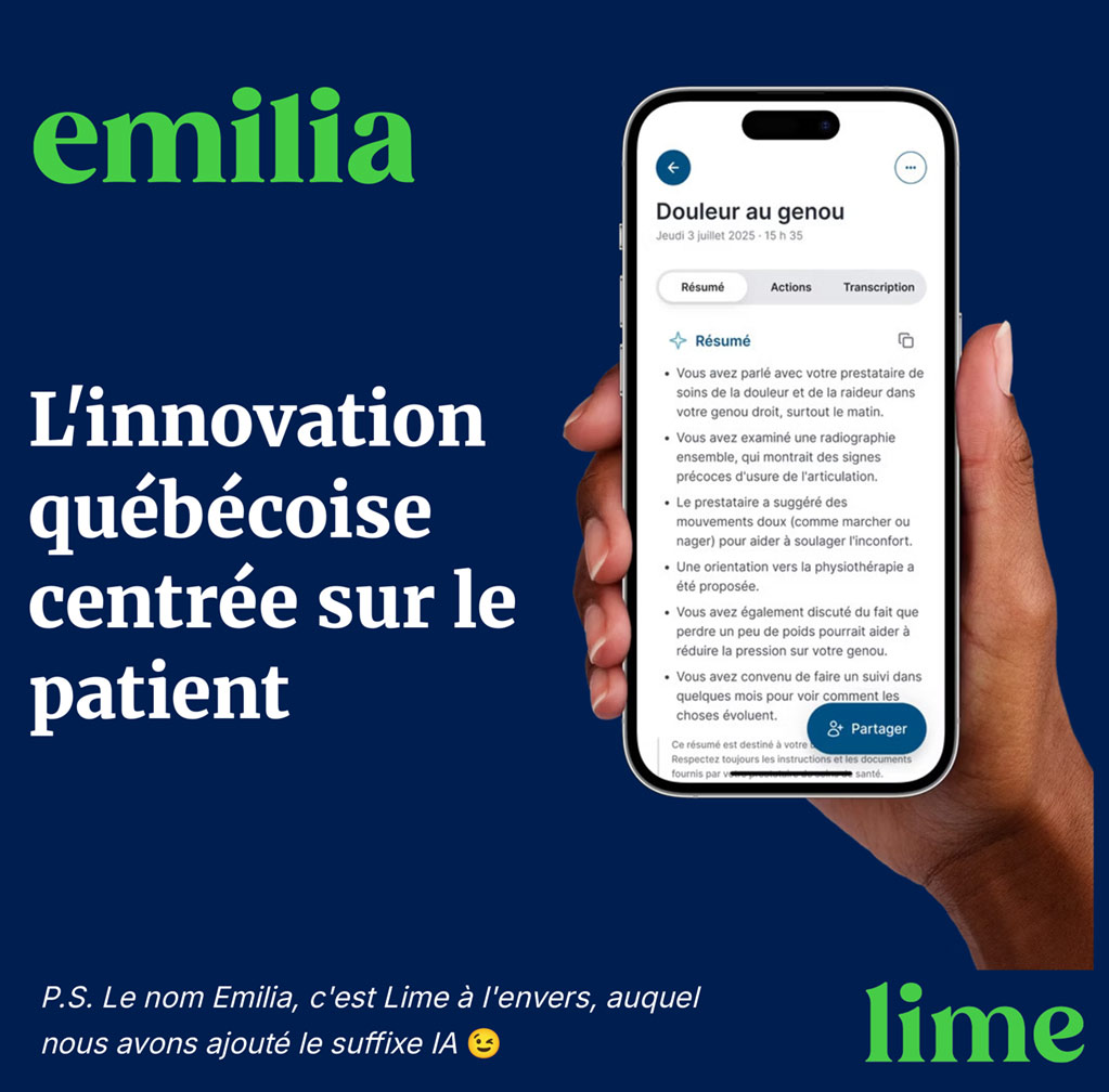 Emilia est une application qui permet l’enregistrement sécurisé des conversations avec son professionnel de la santé. Un résumé est produit par la suite et permet au patient de comprendre et d’avoir son plan de traitement.