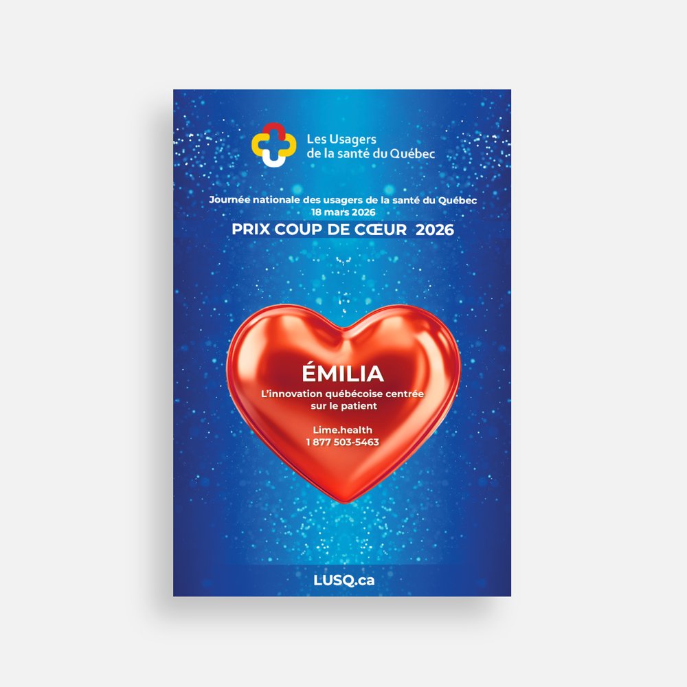 Le Prix Coup de cœur est remis à Lime Santé pour sa plateforme Émilia. Cette application mobile permet aux patients de capter fidèlement les explications de leur professionnel de la santé, dans un langage adapté, pour réduire les oublis et maximiser l’adhésion aux soins.