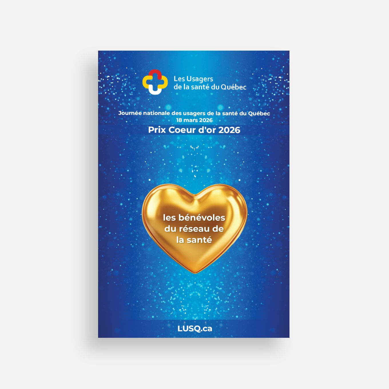 Le Prix Coeur d’or est remis à l’ensemble des bénévoles du réseau de la santé. Une remise symbolique sera faite aux bénévoles de la Maison Michel-Sarrazin, une maison de soins palliatifs pour des personnes en fin de vie, située dans la région de Québec.